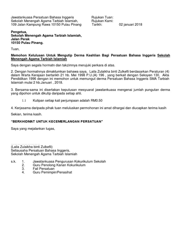 Contoh Surat Kutipan Dferma Kepada Ahli Persatuan